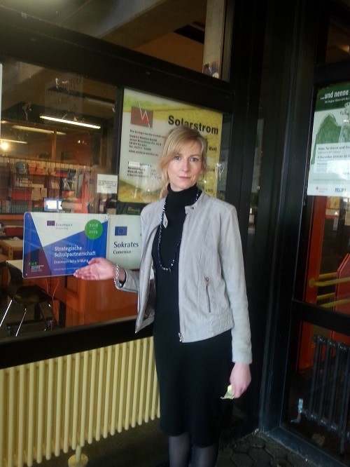 En esta ocasión colocamos oficialmente el emblema del Erasmus+ en la entrada de la escuela.